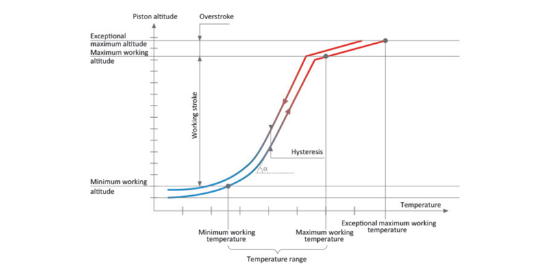The curve shows the precise piston position over the operating temperature range of the thermostat. The curve is plotted in two sections; one with the temperature increasing and the wax expanding, the second with the temperature decreasing and the wax contracting. The dfference between the two curves is called the hysteresis; it is caused by the compression and friction of the internal components and thermal inertia.
