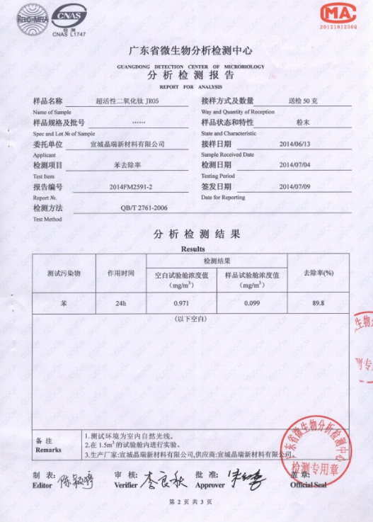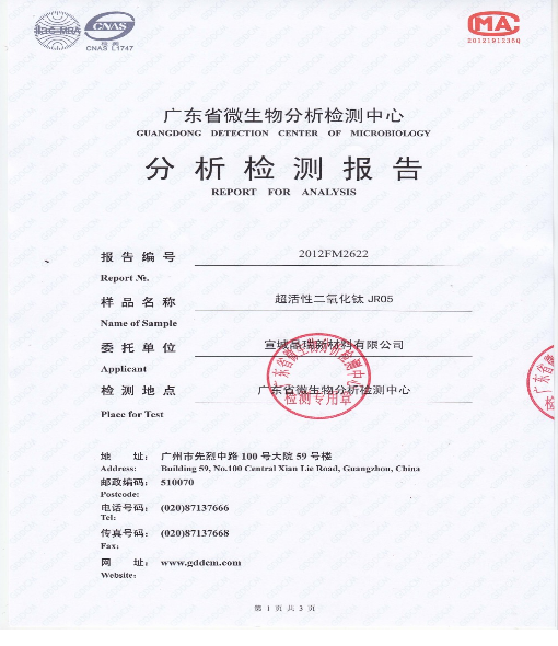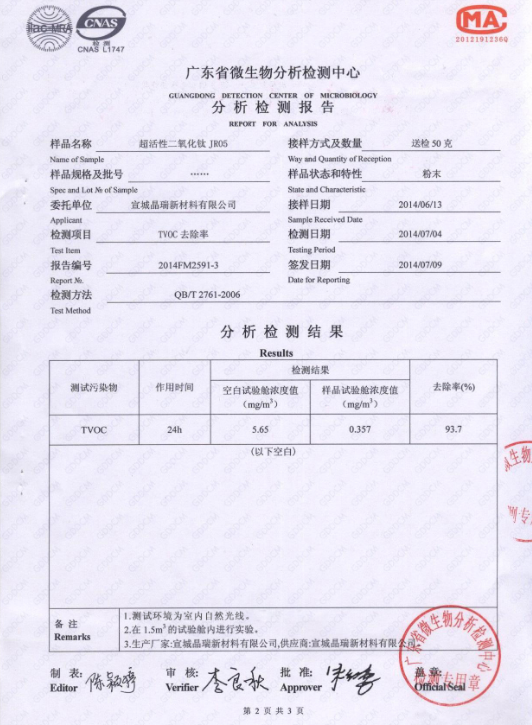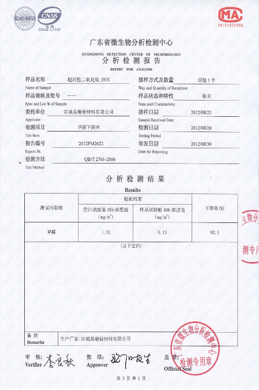 分散性能好:5納米二氧化鈦分散性好,可以自分散到純水里,不需要攪拌。分散好的液體可以噴到家具表面,墻體,形成均勻的納米涂層,起到凈化室內空氣的作用。
