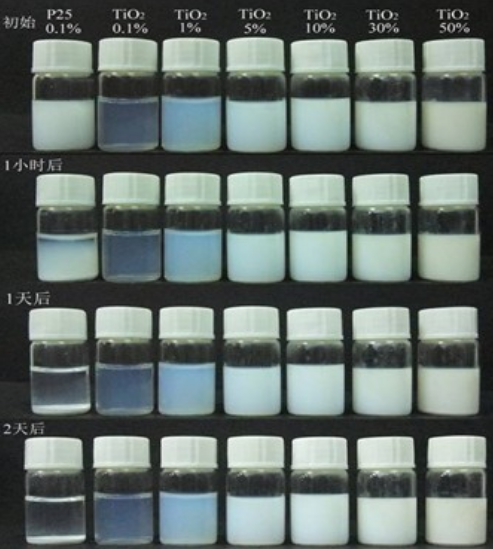 (圖4為不同濃度的二氧化鈦水分散液的實物照片,我們所制備的二氧化鈦的分散液,濃度分別為0.1,1,5,10,30,50%(質量百分比濃度)穩定性好。)