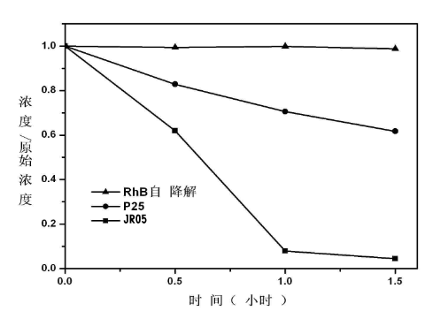 (圖3為模擬太陽光照射下,所制備的二氧化鈦及市售Degussa P25對羅丹明B的降解曲線,從圖中可以看出,所制備的高活性納米二氧化鈦JR05(圖中用TiO2標注)具有很好的光催化活性)