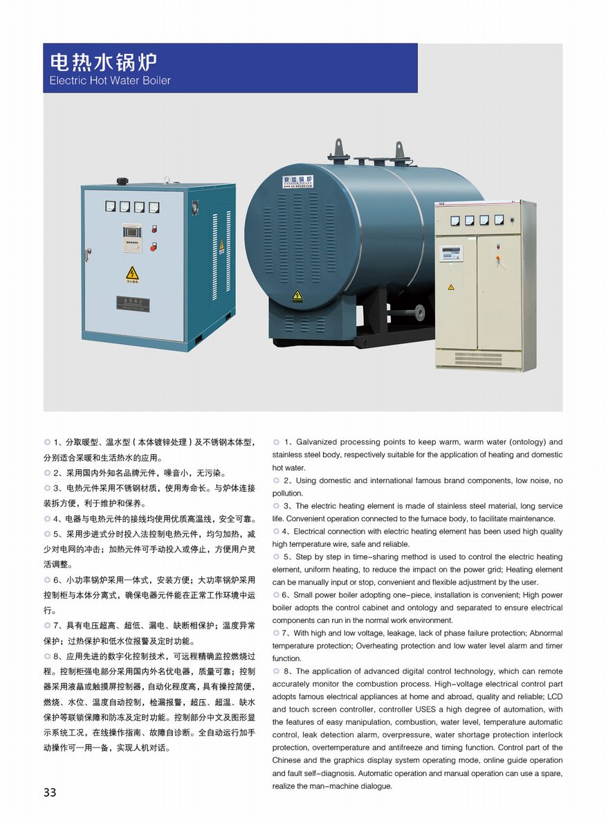 電熱水鍋爐特點(diǎn)[1] 采用國(guó)內(nèi)外優(yōu)質(zhì)品牌電器元件[2] 運(yùn)用步進(jìn)式分時(shí)投入電熱元件[3] 保護(hù)功能齊備、自動(dòng)化程度高