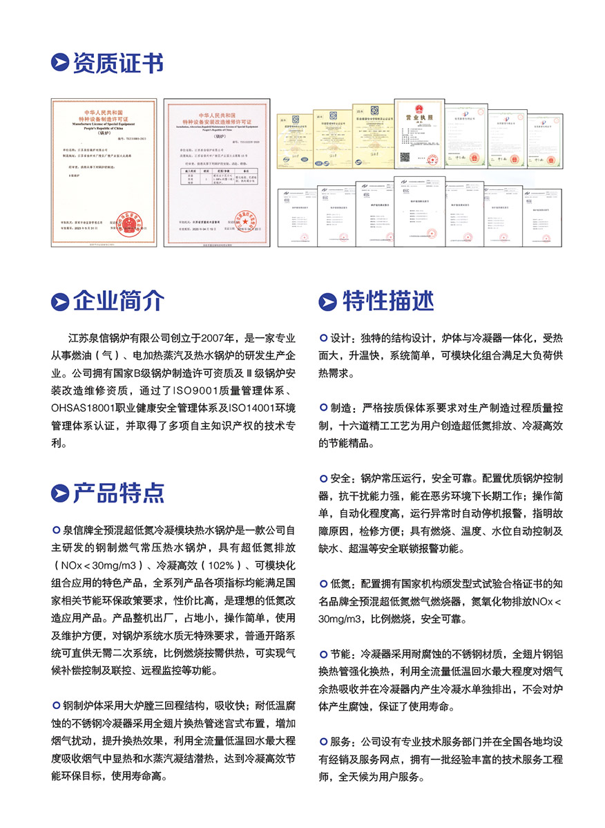 [1] 超低氮排放(NOx<30mg/m3)、冷凝高效(102%)、可模塊化組合應用[2] 整機出廠,占地小,操作簡單,維護方便,對鍋爐系統水質無特殊要求,普通開路系統可直供,比例燃燒按需供熱,可實現氣候補償控制及聯控、遠程監控等功能[3] 使用壽命高