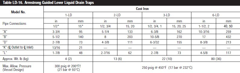 2-LD,3-LD及6-LD鑄鐵導向桿排液閥的半球形的閥瓣、閥座和杠桿在設計材料和制作方法上與6.9MPa壓力以下使用的蒸汽疏水閥是一樣的,此外還附有導向桿確保在所有條件下準確地密封落座。