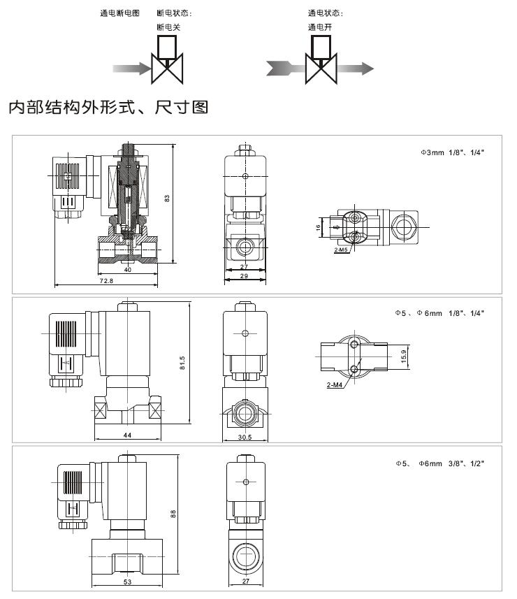 二位二通常閉型電磁閥,斷電關閉,通電打開;產品為系列化生產,體積小,流量大,適用范圍廣