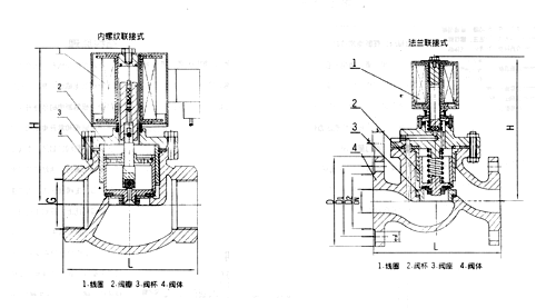 本閥是由副閥和主閥兩大部件構成的先導式二次開閥的電磁閥。是靠副閥的啟閉來控制主閥的通斷。根據斷電時所處開關狀態的不同,可分為常閉電磁閥和常開電磁閥。常閉電磁閥,在斷電常位時,副閥口封閉,主閥呈斷路,當電訊號進入導閥線圈時,活動鐵芯受電磁力作用吸上打開副閥口,主閥閥杯內壓力迅速消失,介質壓力將主閥閥杯托上,開啟主閥口,工作介質硬可流通。但當電訊號消失時,活動鐵芯復位,封閉住副閥口,工作介質自平衡孔進入閥杯內,當壓力趨于平衡時,靠主閥彈簧、閥杯自重及介質壓力使閥杯下移,嚴密封住主閥口,閥又呈關閉狀態。常開電磁閥,在斷電常位時,由彈簧作用,副閥口打開,主閥流通。當電訊號進入副閥線圈時,活動鐵芯受電磁作用吸下,副閥口封閉,工作介質經平衡孔進入閥杯內,當壓力趨于平衡時,靠主閥彈簧、閥杯自重及介質壓力使閥杯下移,嚴密封主閥口,閥門呈關閉狀態。當主閥斷電時,電磁力消失,副閥打開,主閥杯內壓力迅速消失,介質壓力將主閥閥杯托上,開啟主閥口,介質流通,閥呈開啟狀態。