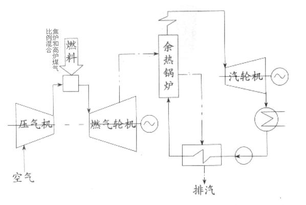 由于焦爐煤氣相對于高爐煤氣熱值較高,因此,一般方案是:燃氣輪機利用熱值較高的焦爐煤氣做功發電,所排出的高溫尾氣全部作為全燃高爐煤氣鍋爐的助燃氣體參與燃燒,這種鍋爐兼有普通燃氣鍋爐與余熱鍋爐的雙重功能,作為普通燃氣鍋爐可以和燃機形成高溫高壓型的等壓等參數的燃氣蒸汽聯合循環系統,作為余熱鍋爐也可以和燃機形成高溫高壓+次高溫高壓的不等參數的燃氣蒸汽聯合循環系統,以進一步提高蒸汽發電效率和對系統的適應能力;通常的工藝簡圖如下: