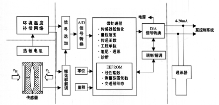 智能變送器的微處理器控制A/D和D/A轉換工作,也能完成自診斷及實現數字通訊。工作時,一個數字壓力值被微處理器所處理,并作為數字存儲,以確保精密的修正和工程單位的轉換。此外,微處理器也能完成傳感器的線性化、量程比、阻尼時間以及其它功能設定。