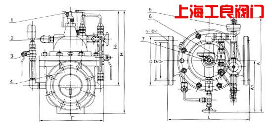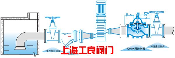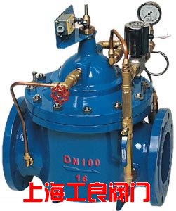 700X多功能水泵控制閥 結(jié)構(gòu)特點和用途 700X多功能水泵控制閥由主閥、電磁導(dǎo)閥、針閥、球閥、單向閥、行程開關(guān)、微形過濾器和壓力表組成水力控制接管系統(tǒng)。水泵需停止工作時,先由進(jìn)口壓使主閥關(guān)閉90%后,水泵停止運轉(zhuǎn)。剩余10%由回水關(guān)閉。可防止水錘現(xiàn)象發(fā)生。 當(dāng)水泵工作閥門向下游供水時,電磁導(dǎo)閥全開,針閥調(diào)至適當(dāng)開度,上游水經(jīng)針閥、單向閥進(jìn)入主閥控制室,經(jīng)電磁導(dǎo)閥流出,此時主閥控制室的壓力保持主閥處于合適的開度,保持下游正常供水。 |