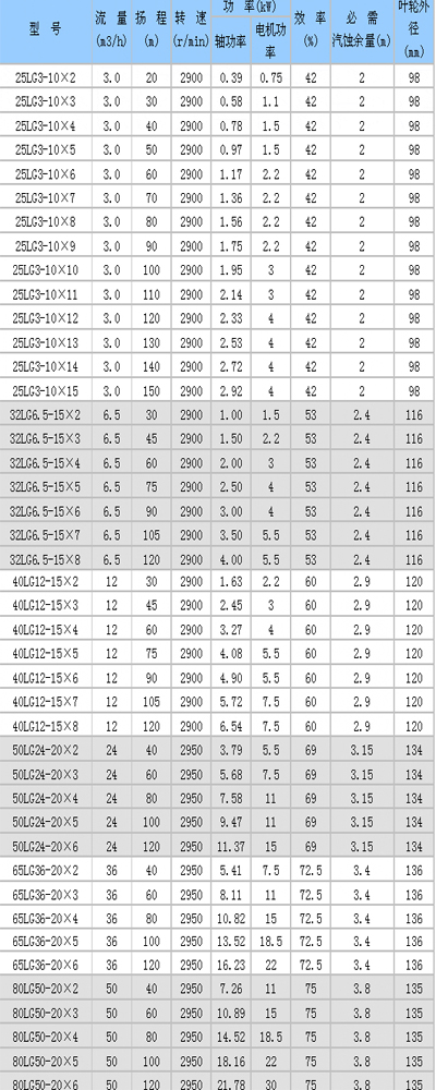四、LG型多級(jí)離心泵技術(shù)參數(shù):